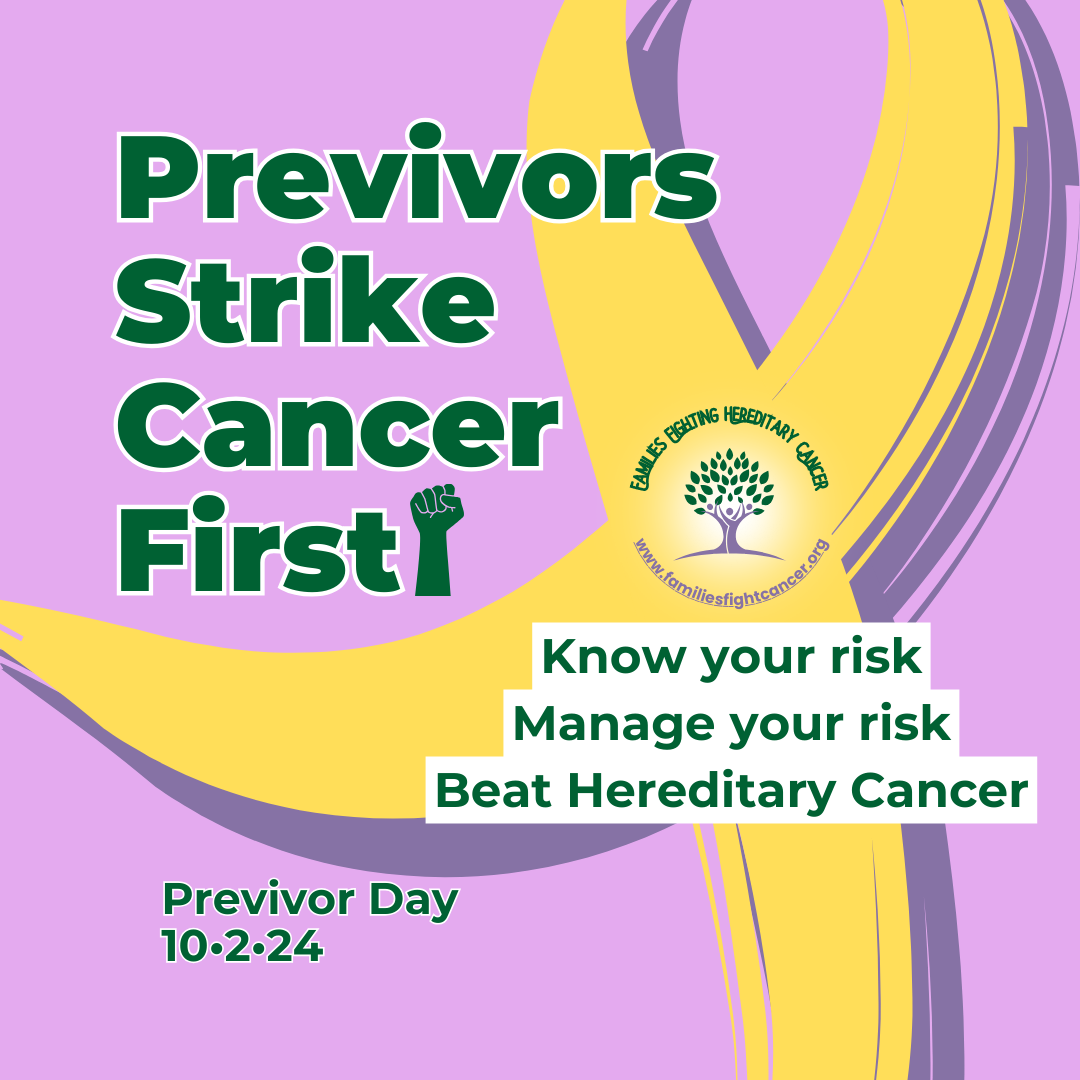 National Previvor Day is part of National Hereditary Cancer Week, (September 29 – October 5), which honors everyone with an increased risk of cancer because of their family history or an inherited gene mutation linked to cancer. This week, join us as we honor all Survivors, Previvors, Caregivers and family members in our community of FIGHTERS and THRIVERS.
